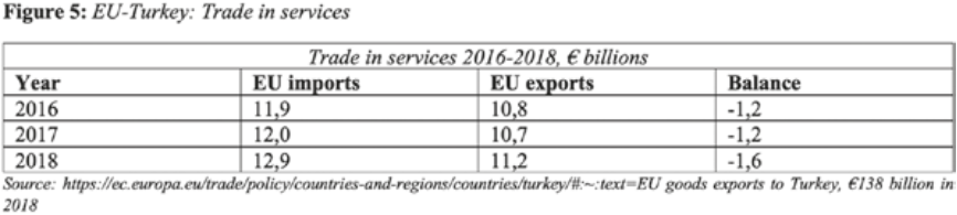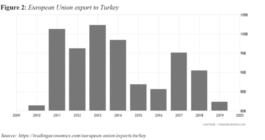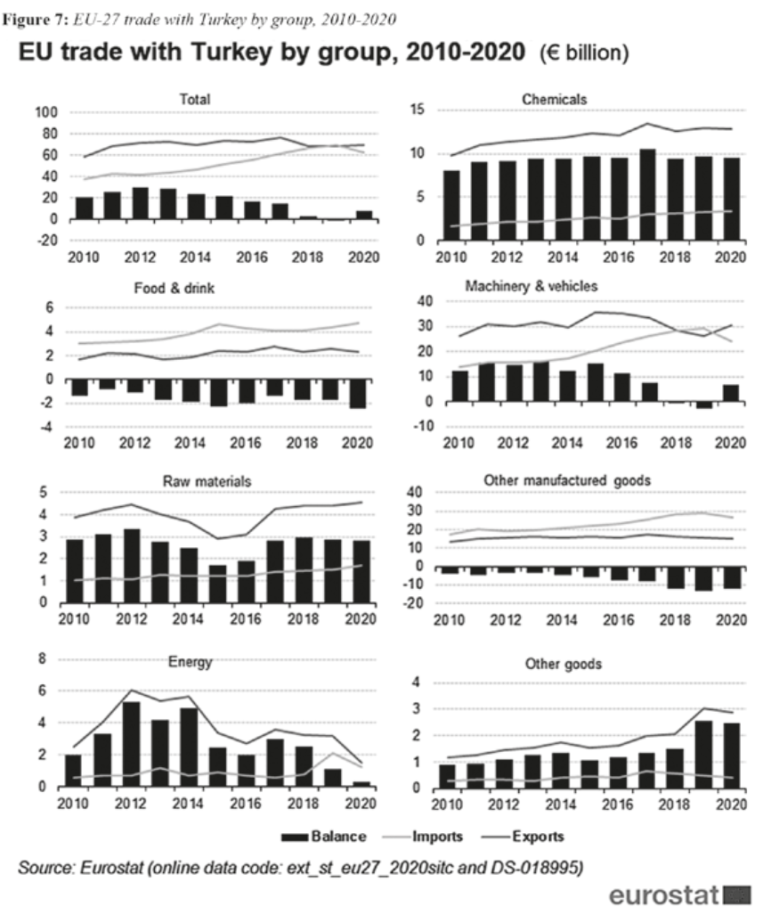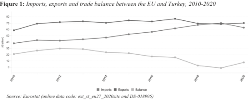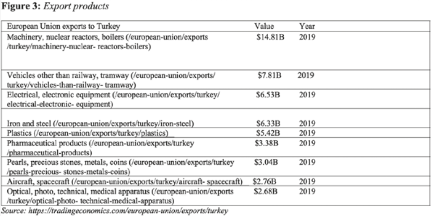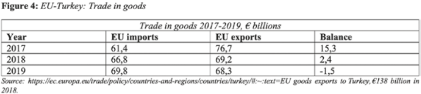 In 2019, Turkey became the fifth-biggest trade partner of the EU. In turn, the EU became Turkey’s first partner in imports and exports (European Commission, 2020). The main export markets for Turkey include the EU (42,4%), the UK, Iraq, the USA and Israel. The EU represents also the biggest share of Turkish imports (32,3%).