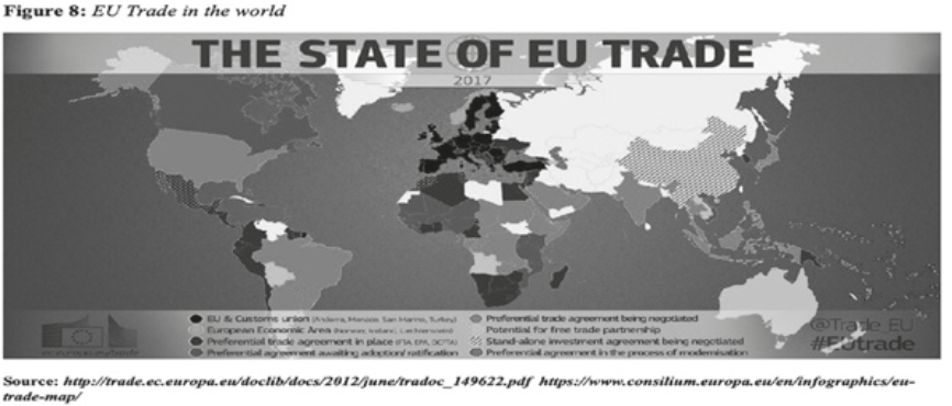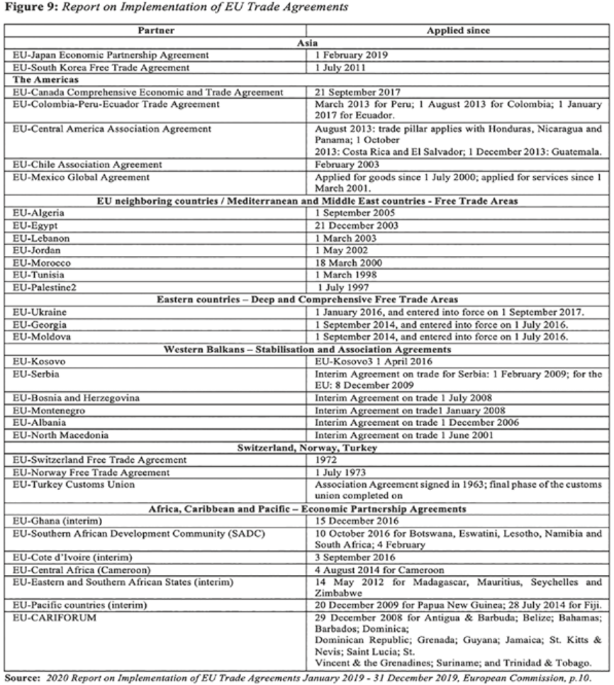 In recent years, and not unrelated to the complicated WTO negotiations, FTAs have become major trade policy instruments for the EU and other players in the global economy (De Lombaerde/Ulyanov, 2020: 88· Akman, 2010: 19· Cengiz/Kurtbağ, 2015: 7). The EU signed several FTAs with various countries and put these agreements into effect over the last years (see Figures 8 and 9).