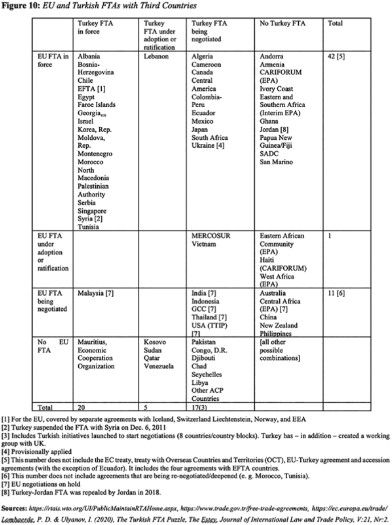 It has been observed that the FTAs, which the EU is a party of and has signed in recent years, have put forth consequences and effects which are not necessarily in the interest of Turkey. It has therefore been suggested that the CU text should be 765updated and better aligned with the current conditions, as it has become nonfunctional and not creating the sought benefits for both parties (Göçmen, 2016: 87).
