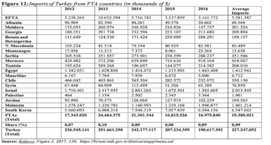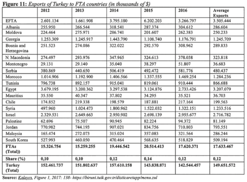 Upon examination of the period 2012 to 2016, it is observed that Turkey’s exports to FTA countries have been generally slightly increasing (Figure 11) (Kalayci, 2017: 138).