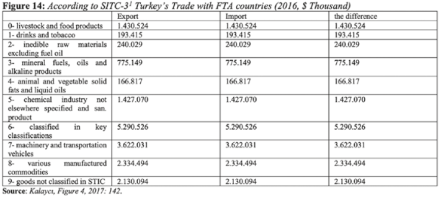 When examining the foreign trade balance of Turkey with FTA countries (Figure 13), we see that Turkey had a foreign trade deficit in the years 2012, 2013 and 2014, whereas it achieved a surplus in the years 2015 and 2016 (Kalayci, 2017: 139).